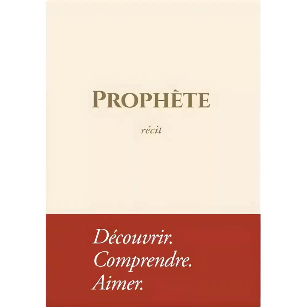 La couverture du livre reflète parfaitement l’esprit du récit. Elle adopte un style épuré et minimaliste. Le visuel se divise en deux parties. La partie supérieure, beige et sobre, présente le titre « Prophète » accompagné du mot « récit » dans une typographie élégante. La partie inférieure, rouge brique, affiche trois mots en blanc :